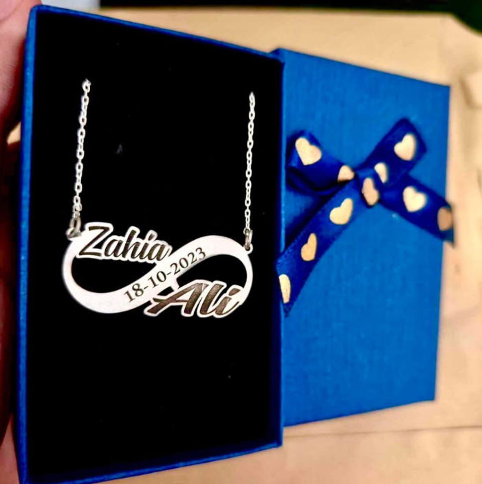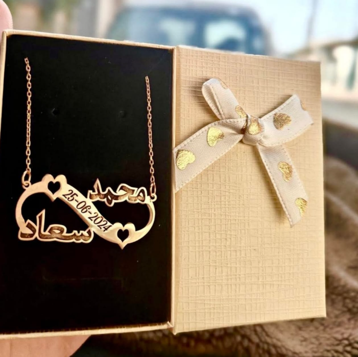 سلسلة أسماء راقية من الفضة الخالصة، متوفرة أيضاً بلمسة ذهبية مشلّة تزيدها فخامة. تصميم شخصي يبرز الاسم بلمسة أنيقة ومميزة تناسب كل الإطلالات.