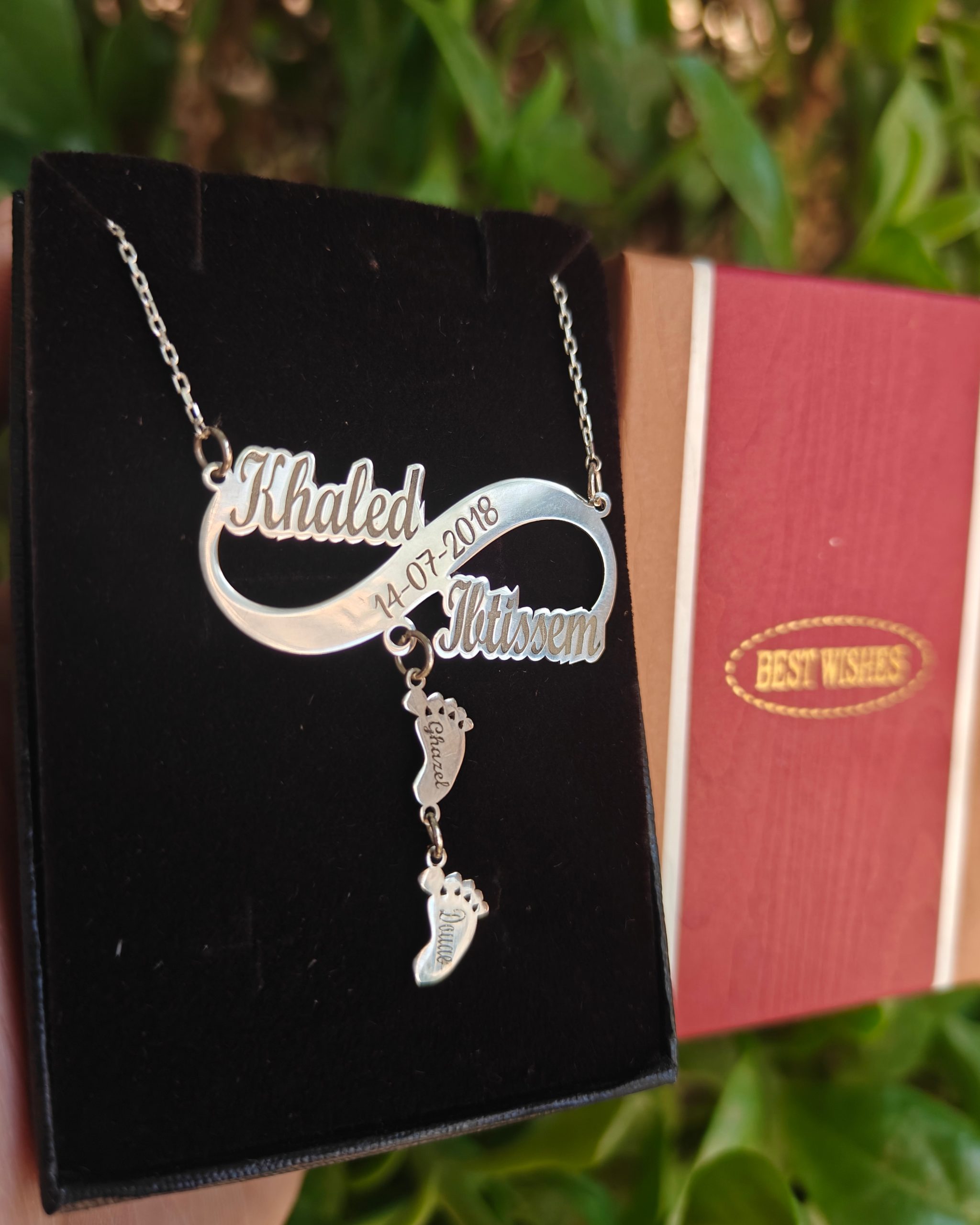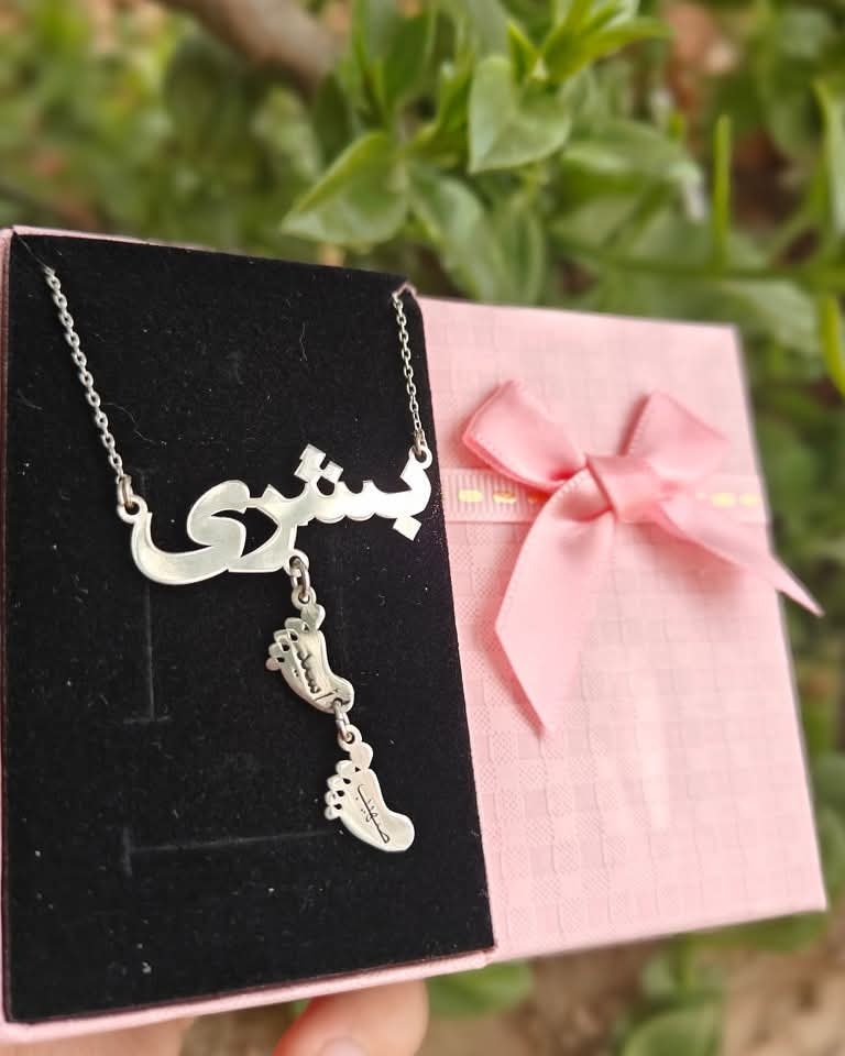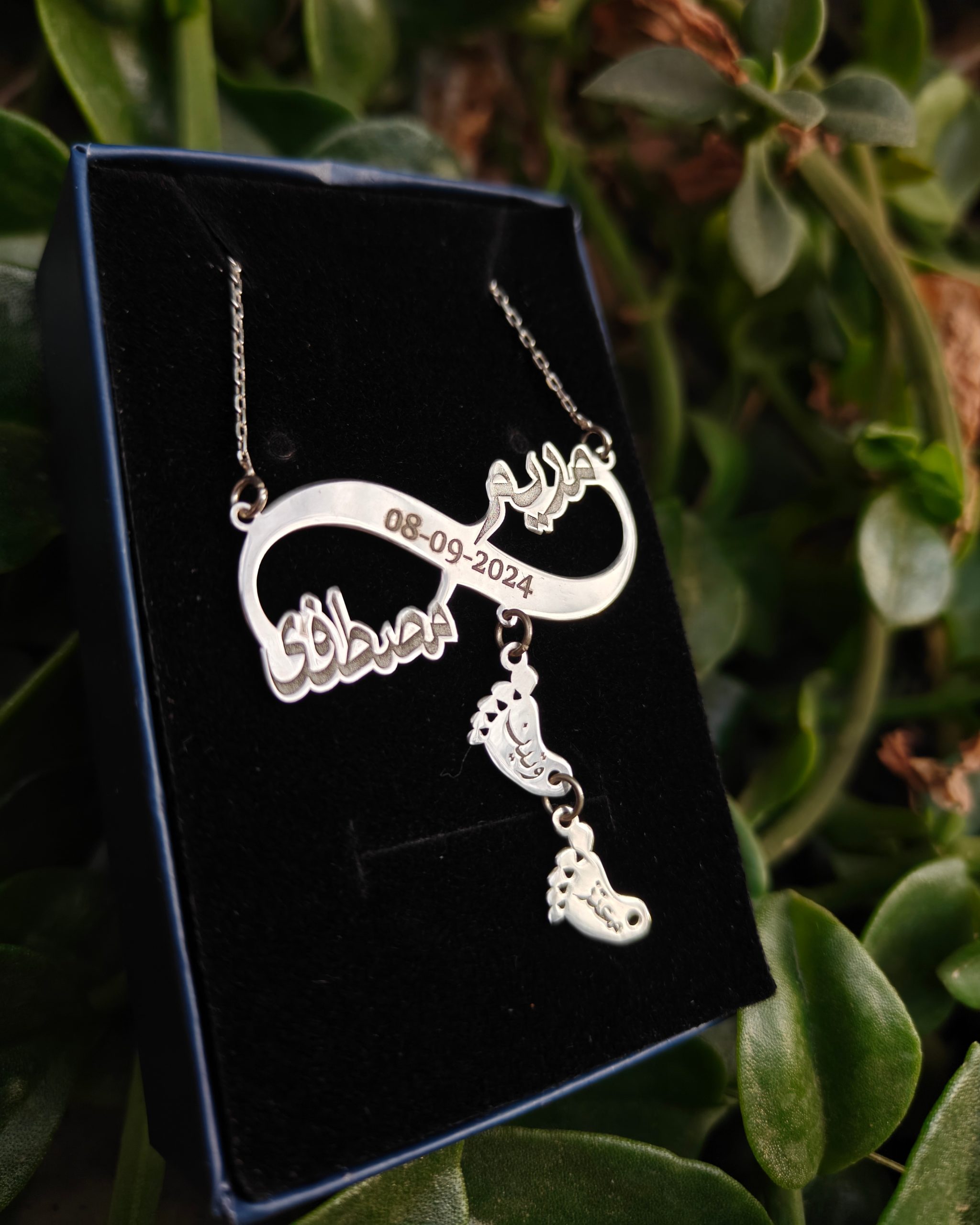 سلسلة أسماء راقية من الفضة الخالصة، متوفرة أيضاً بلمسة ذهبية مشلّة تزيدها فخامة. تصميم شخصي يبرز الاسم بلمسة أنيقة ومميزة تناسب كل الإطلالات.